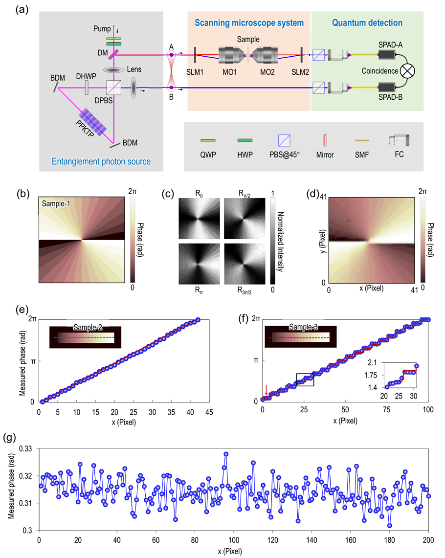 基于QHM,该团队还测量了另外两个相位范围在[0,2π]内的样本。样本2的相位呈线性变化,而样本3的相位呈阶梯式变化。样本2和样本3的实验结果分别如图2e和图2f所示。图中的红线表示理论结果,蓝色圆球对应实验结果。在图2f中,取了0.314弧度的相位步长。从图中可以清楚地看到,理论结果与实验结果相吻合。这表明该团队构建的QHM不仅可以检测相位分布变化缓慢的物体,还可以检测相位分布变化剧烈的物体。
