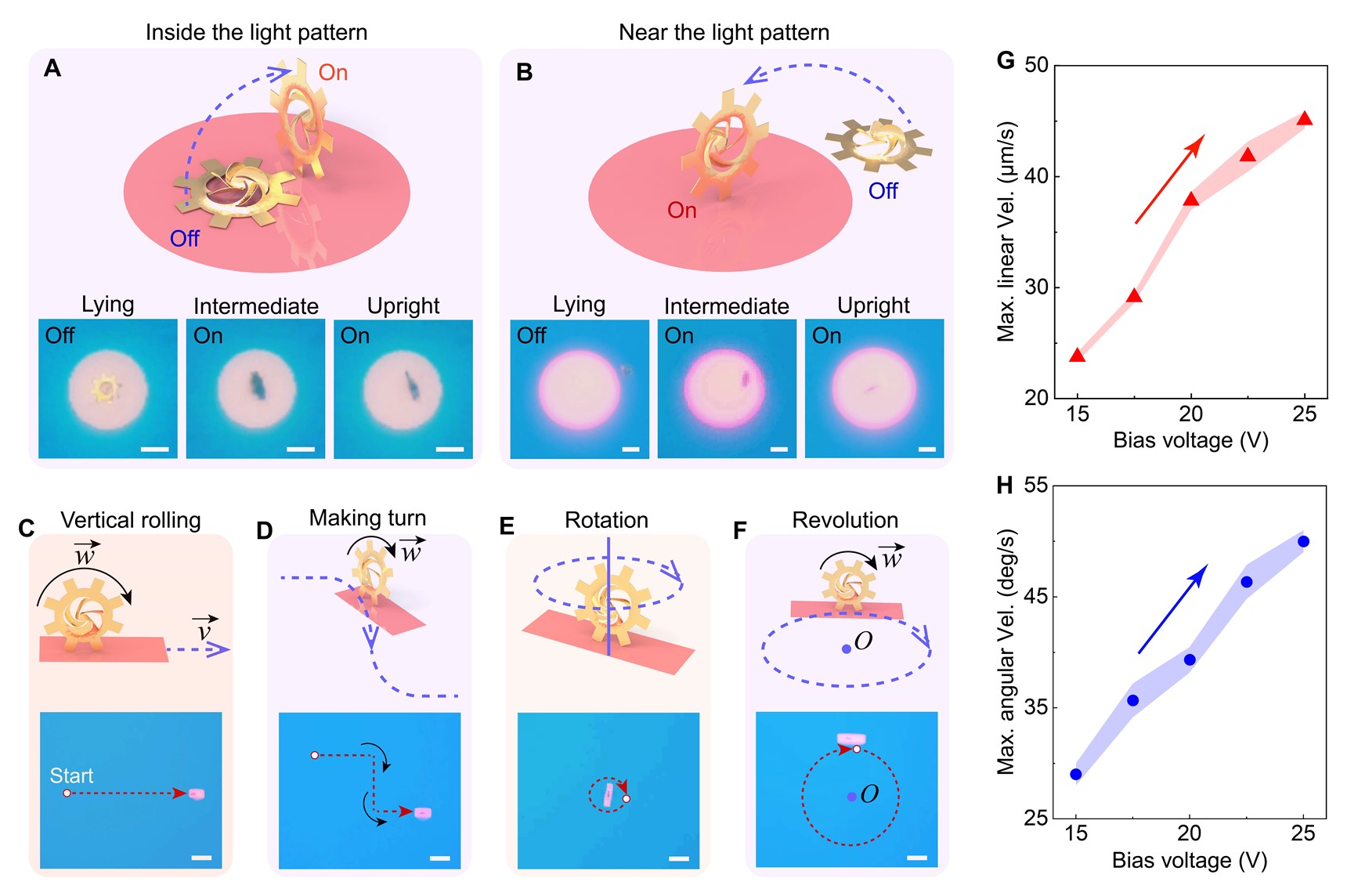 图3:纳米剪纸微型转子的多模态自由驱动实验。(A, B)微型转子的异平面翻转操控示意图及相应的实验捕获图像。比例尺:10 μm;(C-F)微型转子多模态驱动示意图和实验图像,包括垂直滚动、转向、自转以及公转。比例尺:30 μm;(G, H)在(C)和(F)驱动中微型转子的最大前进线速度和公转角速度与施加偏置电压的关系。