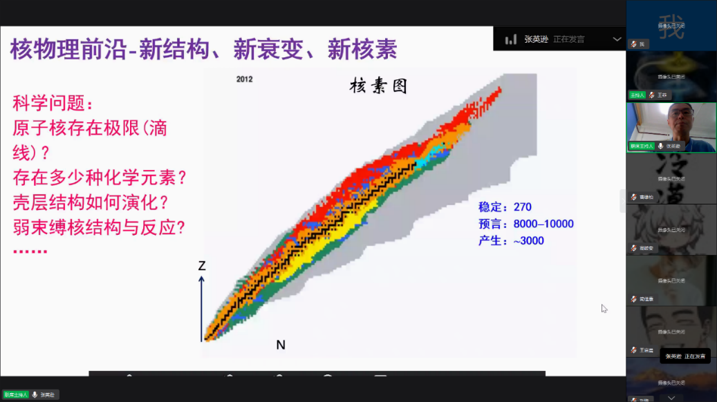 张老师认为,核物理研究的基本问题是原子核乃至核子的构成,核子间的相互作用,多核子体系的组成、性质、运动和演化。核物理前沿聚焦新结构、新衰变、新核素,提出了若干问题:原子核是否存在极限(滴线)?到底存在多少种化学元素?壳层结构如何演化?弱束缚核结构与反应?……核物理预言的核素数大于现在发现的核素数,还有许多问题需要解决,许多猜想需要验证。