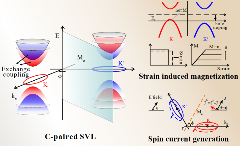 | 摘要: In this talk, I will take our recently proposed new type of spin-valley locking (SVL), named C-paired SVL, in antiferromagnetic systems. It directly connects the spin/valley space with the real space, and hence enables both static and dynamical controls of spin and valley to realize a multifunctional antiferromagnetic material. The new emergent quantum degree of freedom in the C-paired SVL is comprised of spin-polarized valleys related by a crystal symmetry instead of the time-reversal symmetry. Thus, both spin and valley can be accessed by simply breaking the corresponding crystal symmetry. Typically, one can use a strain field to induce a large net valley polarization/magnetization and use a charge current to generate a large noncollinear spin current. We predict the realization of the C-paired SVL in monolayer V2Se2O, which indeed exhibits giant piezomagnetism and can generate a large transverse spin current. Based on symmetry analysis and first-principles calculations, we also found C-paired SVL can exist in the following experimentally verified AFM materials, NaOsO3, LaMnO3, LaCrO3, TbFeO3, MnTe, RuO2, MnF2, FeF2, CoF2, and NiF2. All these predicted phenomena have been confirmed in recent experiments in RuO2 and MnTe. Our findings provide new opportunities to integrate various controls of spin and valley with nonvolatile information storage in a single material, which is highly desirable for versatile fundamental research and device applications. Reference: Nature Communications 12, 2846 (2021)
