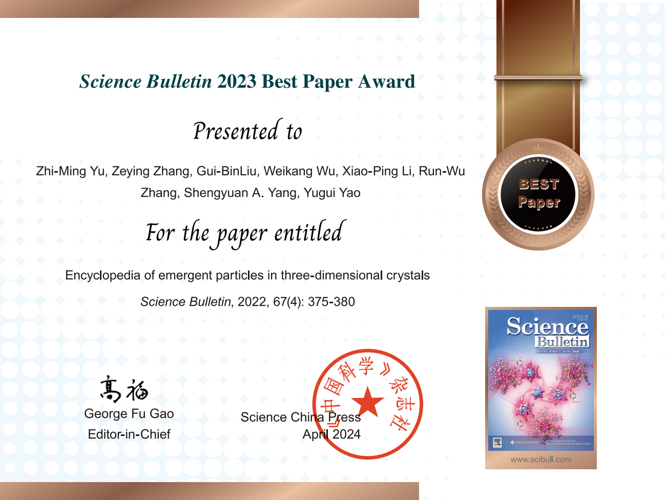 日前,《科学通报》(英文版, Science Bulletin )公布了2023年度高影响力论文评选结果。欧冠官方网站姚裕贵教授课题组署名论文《三维晶体中的演生粒子百科全书》【Encyclopedia of emergent particles in three-dimensional crystals; Science Bulletin 67 (2022) 375–380】入选年度“2023 Best Paper Award”。该论文欧冠投注官网入口为第一完成单位,欧冠投注官网入口余智明教授和北京化工大学张泽英副教授为共同第一作者,欧冠投注官网入口姚裕贵教授为唯一通讯作者。欧冠投注官网入口刘贵斌副教授和新加坡科技设计大学杨声远教授(现任职于澳门大学)等人对该项研究也有重要贡献。
