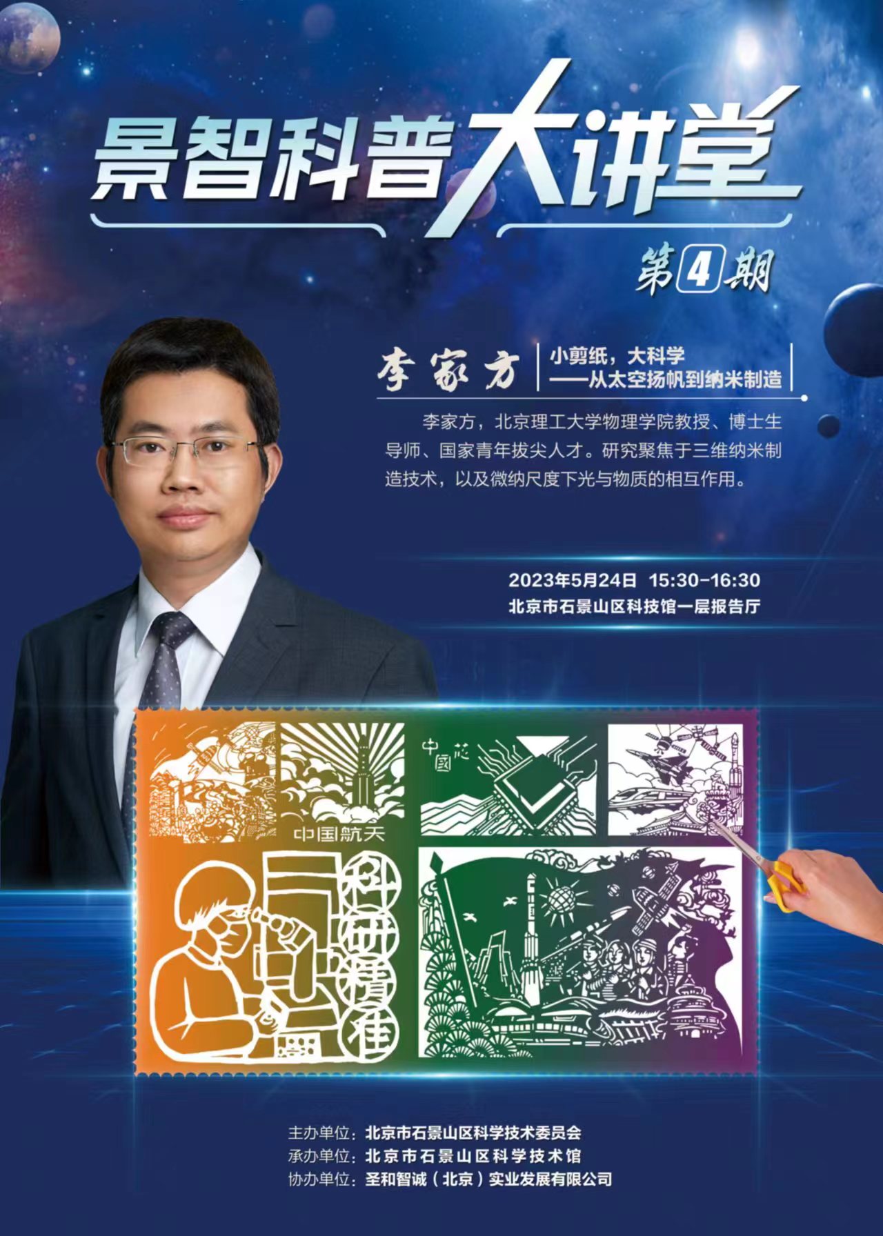 一把剪刀,一张薄纸,大千世界就可以跃然纸上。北理工欧冠官方网站副院长、国家青年拔尖人才李家方教授聚焦三维纳米制造“卡脖子”技术难题,2018年在国际上首次实现了纳米剪纸三维微纳制造技术,该系列研究受邀参与国际会议报告10余次,并受邀参与央视节目录制。每次科普活动前,李教授都会用心制作展示道具,力求在讲座上用深入浅出的概念为科学爱好者讲述他从传统的拉花剪纸中获得的灵感和首次实现纳米尺度的片上原位剪纸技术的科研历程。