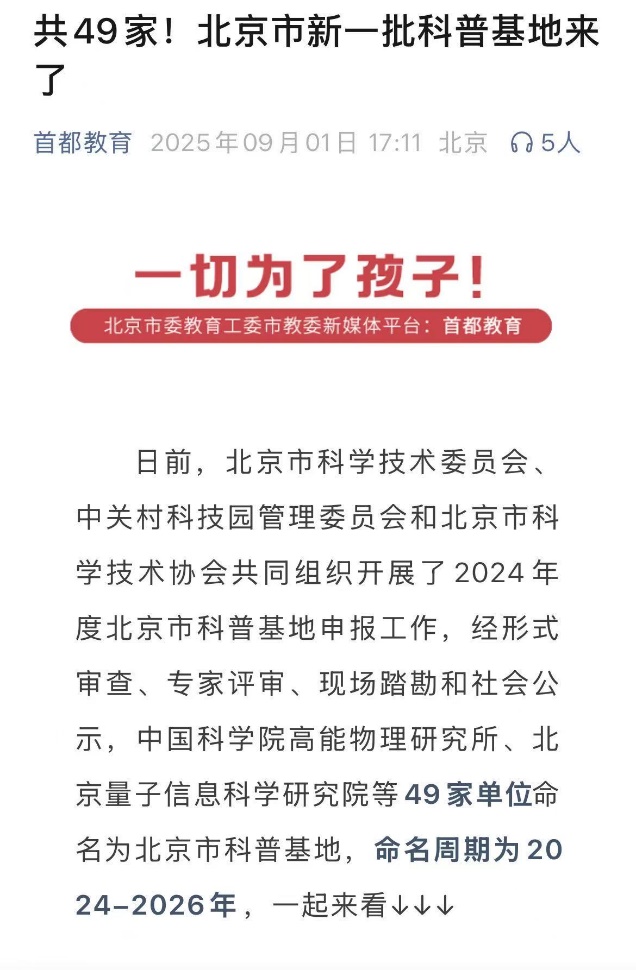 近日,北京市科学技术委员会等单位共同公布了北京市科普基地评审结果,欧冠科学传播基地成功获评2024“北京市科普基地”称号。