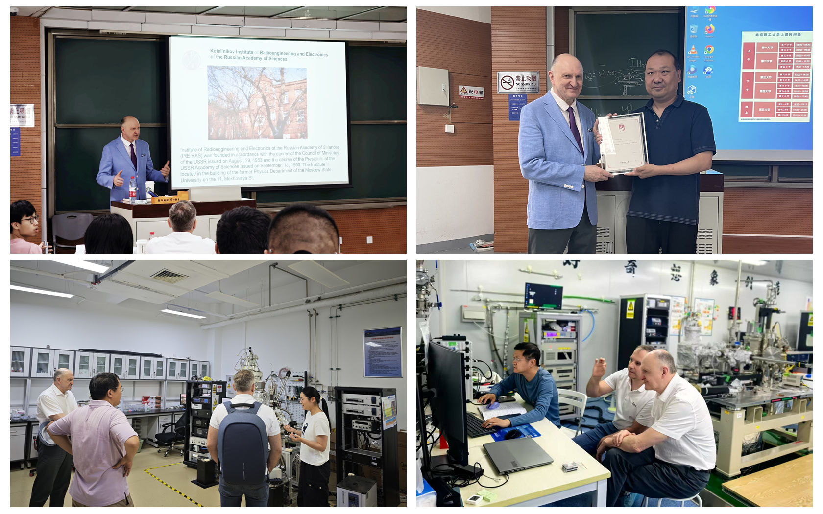 访问期间,尼基托夫与欧冠多个课题组就先进量子功能材料的设计、制备与调控等前沿方向进行了深入研讨;在欧冠官方网站作题 为《Antiferromagnetic Spintronics and Magnonics》的“百家大讲堂”学术报告,围绕反铁磁自旋电子学与磁振子研究领域的最新进展,与师生深入交流;访问了量子物理实验中心、低维量子结构与器件工信部重点实验室,并与科研人员进行交流。此外,在欧冠官方网站的积极协调下,代表团一行还访问了中国科学院物理研究所。